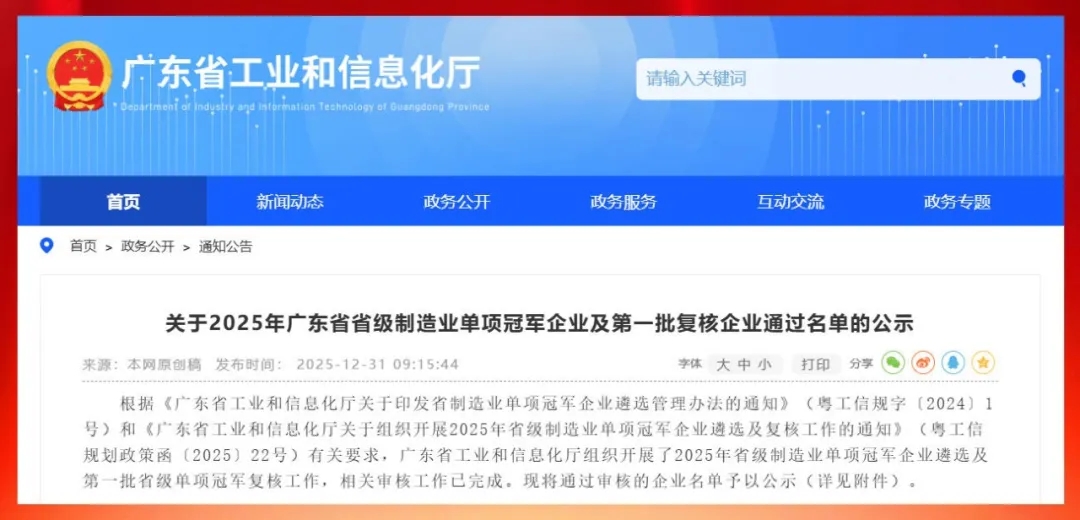 2025年12月31日,廣東省工業和信息化廳發布了《2025年廣東省省級制造業單項冠軍企業及第一批復核企業通過名單的公示》,廣東貝洛新材料科技有限公司成功入選省級制造業單項冠軍企業。
