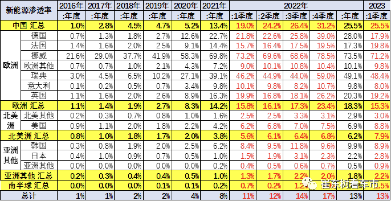 崔東樹指出,世界新能源車滲透率總體呈現快速提升趨勢,2022年4季度已經達到17%水平,2023年1季度達到13%,其中中國新能源滲透率達到25%,德國達到18%,挪威達到71%,美國僅有8.8%,日本僅有3%,因此世界新能源發展的不均衡性極為明顯。隨著中國繼續強化新能源發展,美國加大新能源的鼓勵政策,世界新能源車進入強勢發展的新階段。